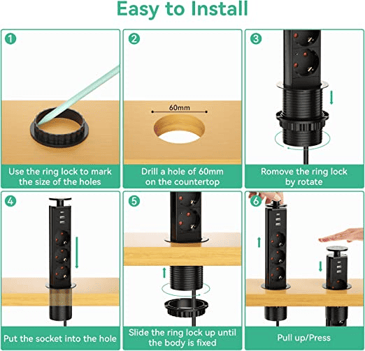 L’installation est assez simple. Il suffit de faire un trou avec une sic cloche de 60 mm de diamètre et puis d’y insérer la multiprise escamotable, puis de la visser par le bas pour qu’elle ne bouge pas et finalement de la connecter à une prise murale. Simple ? Oui, mais pas cette fois-ci.