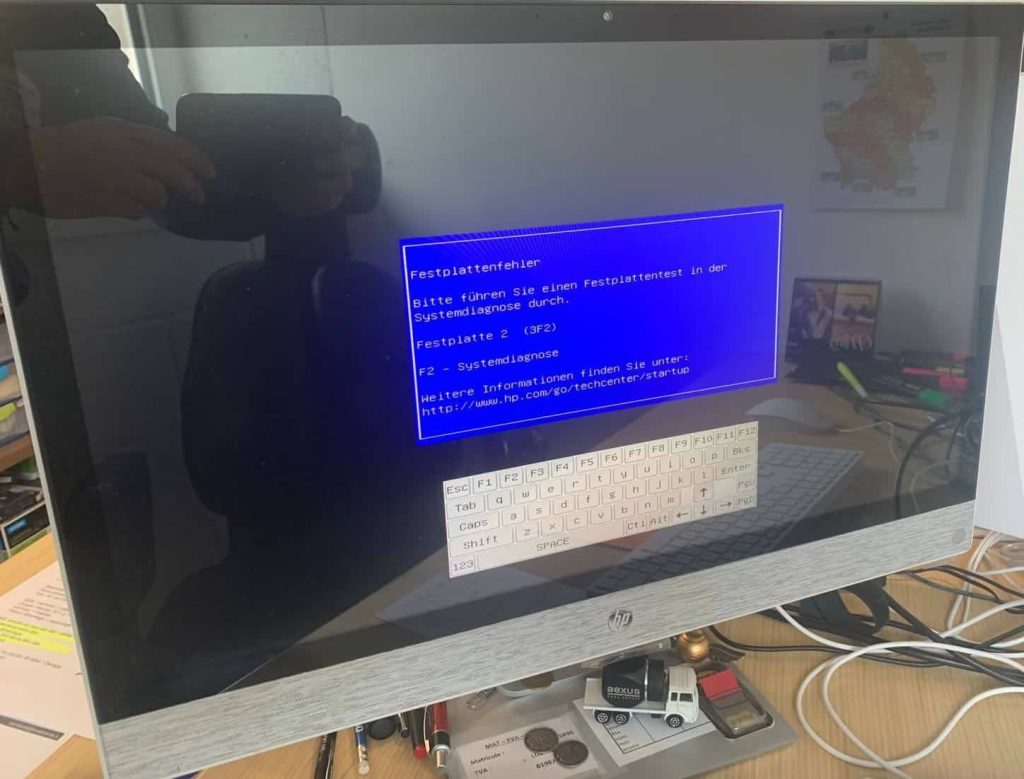 Suite à la demande d’une de nos clientes, nous avons effectué la réparation d’un ordinateur tout-en-un HP 24-r168ng. L’ordinateur rencontrait un problème de démarrage et affichait un message en allemand signalant une erreur liée au disque dur.